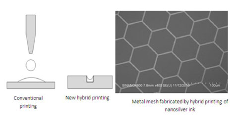 インクは、例えば銀ペーストに含ませる銀の粒子をナノメートルサイズという非常に細かくすると、配線上の導電体が密になり抵抗が下がる。これを利用して細かい配線のメッシュの導電体を高価なITOと置き換えてコストを下げる技術もある。図2はナノ粒子のインクを、細いハニカムパターンに印刷で形成、これで配線を作るとほぼ透明な電極ができる。ただし、銀ナノ粒子のインクはまだ高価だが、いずれ安くなり、1kg単価で2000ドルになるだろうと、IDTechExのコンサルティング部門長のKhasha Ghaffazadeh氏は見ている。