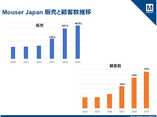 半導体ディストリビュータのMouser Electronicsが日本市場で販売額、顧客数とも伸ばし続けている。WSTS(世界半導体市場統計)によると、世界の半導体市場は2019年に前年比12%も下落したが、Mouserの世界売り上げは1%しか落ちなかった。日本では販売額で前年比9.5%成長を遂げた(図1)。中でも半導体と組み込み系、センサなどが成長した。