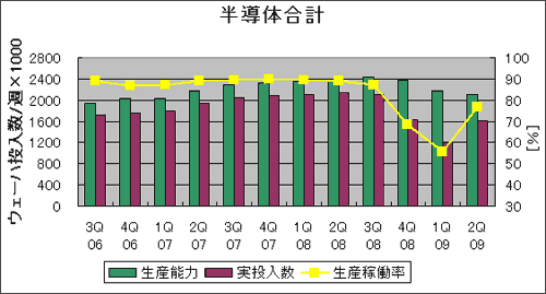 ウェーハ生産稼働率は2009年第1四半期(1Q)の55.6%から第2四半期(2Q)は76.7%に上がった。これは、世界不況の影響が大きく現れた2008年4Qの68.4%を上回っている。しかも生産量の絶対値も4Qに追いついた。2008年4Qは163.1万枚/週だったが、2009年2Qは161.4万枚/週と同じレベルに達した。