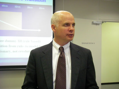 メンターはこのツールにより、バーチャルCMPモデルを提供していることになる。このCalibre DFMプラットフォームを使って、英国のファブレスCSR社が設計した65nmデバイスは1発完動したとWilson氏はいう。この場合は、CalibreをファウンドリであるTSMCが使って配線厚のDFM補正しタイミングシミュレーションを駆使し、最終マスクデータをTSMCが起こした。CSR社は物理設計にまでは関与しないため、RTLデータをTSMCに手渡し、スペックを満たしていることを確認するだけ。GDS IIフォーマットのマスクデータはメンターのツールを使ってTSMCが作成する。
