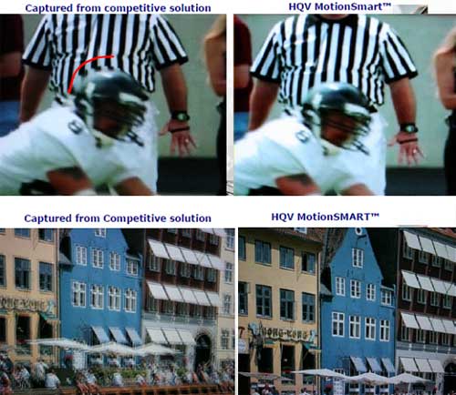 今回IDTが液晶テレビに組み込んでデモンストレーションしたのが、フレームレートを120Hzあるいは240Hzに上げてもギザギザのノイズを除去するというもの。従来、フレームレートコンバータはレート(速度)を上げる場合に、通常30枚/秒のフレームを60枚/秒なら60枚のフレームすなわち2枚に1枚追加することで、60枚/秒のように見せかける技術である。素早い動きの物体を追いかけるシーンでは、物体が残像のように残ってしまうが、高速のフレームレートはこの残像を消してくれる。この結果、素早く動く物体があってもその物体をきれいに見せることができる。