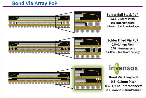 最初の多ピン化技術はBVA(bond via array)と呼ばれており、一つのパッケージともう一つのパッケージを向かい合わせに接着させるPoP技術に向く。従来のPoP技術だと半田ボール同士を接合するとボールがつぶれて隣接端子がくっつきそうになるため、ピッチの幅を十分広くとっておく必要がある。14mm×14mmパッケージだと0.65〜0.50mmピッチが最小であった。このためピン数を増やしたくても最大168ピンしか実現できない。最近では、アムコア(Amkor)社の持つTMV(through mold via)と呼ばれる、モールドに穴 開けして半田を接続する技術が登場し、より微細なピッチを実現しようとしてきた。アムコアはこの技術を新光電気工業にライセンス供与した。しかし、この技術でも0.5〜0.4mmくらいのピッチまでが限界で、240ピン程度までだとインベンサスの佐藤広陽氏は見る。