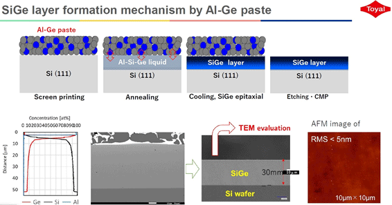 Si基板上にGe層を短時間で安価に作製する方法を東洋アルミニウムが開発した。Ge層の厚さを自由に変えられるだけではなく、ストイキオメトリ(化学組成)も制御できる。今のところ高価なGaAs系半導体向けの基板としての道を提案している。安価な太陽電池やSiフォトニクス、スピントロニクスなどの基板材料への応用を狙っている。